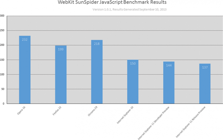These are of course very minor differences. Microsoft managed to improve its average SunSpider score by just 7ms, from 144ms in the Developer Preview to 137ms in the Release Preview.