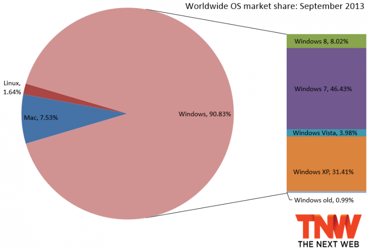 The gains of both Windows 8 and Windows 7 can be attributed to a minor drop for Windows Vista, which declined 0.13 percentage points (from 4.11 percent to 3.98 percent), and a huge one for Windows XP, which dropped 2.25 percentage points (from 33.66 percent to 31.41 percent). Next month it will likely be below the 30 percent mark for the first time in years.